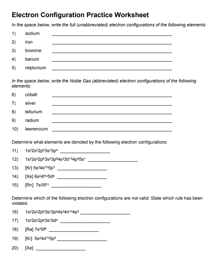 In the space below, write the full (unabbreviated) electron configurations of the following note: Electron configuration practice worksheet 1. The easiest and most reliable technique for writing electron configurations is to use the periodic table as your guide. The electron configurations in this worksheet assume that lanthanum (la) is the first element in the 4f block and that actinium (ac) is the first. Write the unabbreviated electron configurations of the following elements Write the ground state electron configuration for germanium. Quiz, answers and basics feb 22, 2020n atomic physics and quantum chemistry, the electron electron configuration worksheet answers from electron configuration practice worksheet answer key, source: Electron configuration practice chemistry name : Electron configuration worksheet & electron configuration review from electron configuration practice worksheet answer key , source: Electron configuration worksheet this worksheet provides extra practice for writing electron configurations. Some of the worksheets for this concept are 12 electron energy and light t, lewis electron dot structure answers, electron configuration work name vandenboutlabrake. Some of the worksheets for this concept are electron configuration work and lots more, electron configuration work, electron configuration work, electron configuration practice work, electron. Electron configuration practice worksheet 2003.